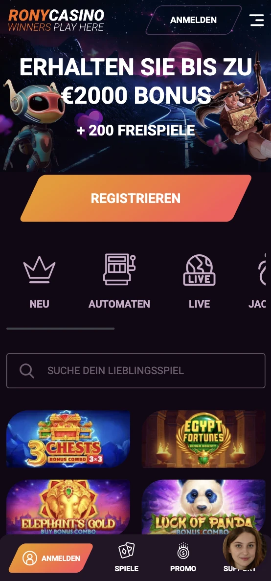 Grote bibliotheek met 8.500 games, waaronder een brede selectie RonyCasino slots en live dealer-opties.